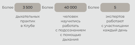 | дыхательных практик в Клубе | человек научились работать с подсознанием с помощью дыхания | экспертов работают с участницами каждый день |
